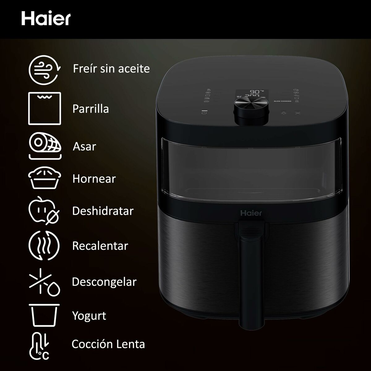 La Air Fryer I-Master Series 5 de Haier es más que una freidora de aire, es un auténtico sous chef con un diseño excepcional. En realidad, es 9 en 1. Gracias a su control de temperatura preciso y amplio, puedes disfrutar de todos los métodos de preparación de alimentos, incluyendo la cocción lenta y el asado. Además, su ventana superior de vidrio transparente es fácil de usar y limpiar, lo que te permite comprobar el progreso de la cocción sin abrir la cesta y perder calor. Un todo en uno para tu cocina que te permite ahorrar hasta un 70% de energía, un 50% de tiempo y un 90% de calorías.
