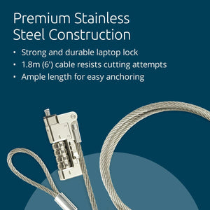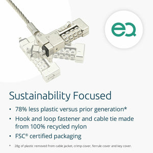 Kensington Slim NanoSaver 2.0 EQ. Color del producto: Plata, Mejores usos: Portátil, Tipo de candado: Cerradura con combinación. Longitud de cable: 1,8 m, Diámetro de cable: 5 mm, Peso: 177 g. Cantidad por paquete: 1 pieza(s), Ancho del paquete: 30 mm, Profundidad del paquete: 134 mm. Ancho de la caja principal: 420 mm, Longitud de la caja: 286 mm, Alto de la caja principal: 173 mm